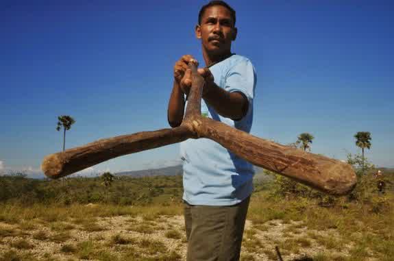 Jika komodo menyerang atau mengejar tiba-tiba, ujung tongkat yang bercabang digunakan untuk menekan leher komodo, dalam waktu singkat komodo akan melemah dan berhenti menyerang.